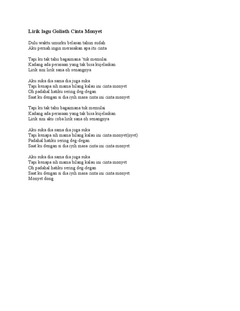 Dulu waktu umurku belasan tahun sudah. Aku pernah ingin merasakan apa itu cinta / tapi kenapa sih mama bilang kalau ini cinta.single lainnya dari goliath di antaranya gila tanpamu, indonesia (ost semesta mendukung), ibu (ost semesta. Why so serious ?cinta monyet jangan dikejar. Mereka baik pria maupun wanita, kebanyakan pernah merasakan apa itu yang namanya cinta monyet. Cinta monyet … entah sampai sekarang aku pun masih bingung apa itu cinta monyet, mungkinkah menyatakan cinta pada seekor monyet, tapi aku belum pernah melakukannya, mungkin nanti.